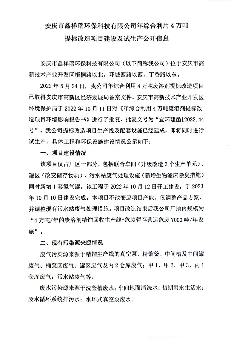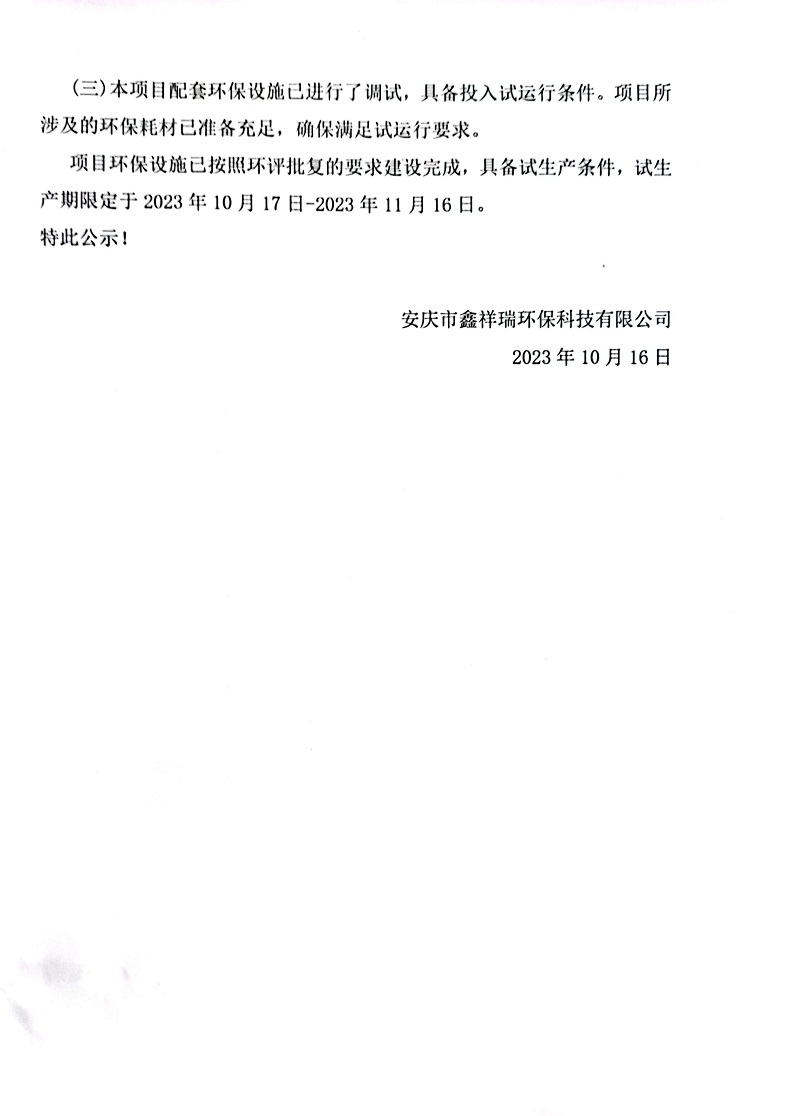安慶市鑫祥瑞環(huán)保科技有限公司年綜合利用4萬(wàn)噸提標(biāo)改造項(xiàng)目建設(shè)及試生產(chǎn)公開(kāi)信息